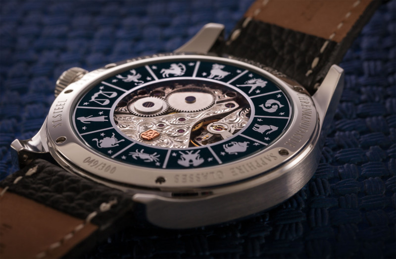 ciferník: skeletizovaný, so zverokruhom z prírodnej perlete